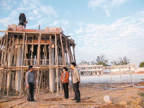 葵潭農(nóng)場黨委書記鐘惠明(中)、場長林慶忠(右)在場部社區(qū)文化廣場建設(shè)工地檢查工作。